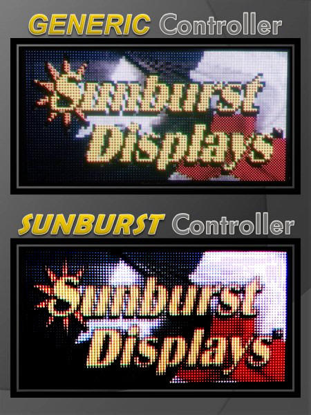 You already know how to program the sign because there's no new proprietary programming system to learn. However, tutorials are a part of our programming. Proprietary is BAD, not good. Our system uses the ingenuity and creativity of thousands of software engineers, not just a small handful of programmers. In the worst of all signs, the software to program the computer inside the sign is not even in the sign owner's possession. It is not on the programming computer, it is "on the cloud" (aka: OneDrive® or Google Drive®.) The sign’s computer must have high-speed internet access, and be “on” 24/7. What if the sign manufacturer does not actually own the software, he uses a third-party system, and they notify you that in order to keep your sign operating you will now have to pay them $2,000 per month to continue access to the programming software. This happens all the time with other "free" software. Or, he controls the software "on the cloud" but goes out of business so your sign cannot be programmed by anyone. Our programming is quick and easy, and “automatically” brings you more and more customers, without ANY increase in expenses! Standard features of our programming software include: o Encryption so that no one else can operate the sign. o The programming computer's screen displays exactly what the sign will look like. o Our software, in the programming computer and not on the “cloud”, automatically enlarges your graphics and videos to fit the screen, with no additional steps required. o Displays can be programmed using PowerPoint®, CorelDRAW®, Photoshop®, or any graphics software. o "Pixel Text" can be directly entered. o You can add multiple images at once, speeding set-up time. o The computer communicates with the sign via Wi-Fi, or Cat 5 cable, and only needs to be "on" when changing the program. The sign runs on its own internal processor. You can create a program at home, and download it to your sign when you get to your business, if you desire. o One click updates the sign. o The sign is capable of being connected to the internet, so that you can program your sign from home! o Our system allows for the use of Text, Graphics, Animation, Slideshow, Video, Scheduling, Time, Temperature, and Automatic Brightness Control as described individually below. Do you know that a .jpg image file automatically adjusts pixel locations as the image is scaled larger or smaller, to continuously create an image with smooth edges – not the choppy “building block” look of older image files (and older LED displays.) Sunburst’s programming software does this also, to display the best image possible. Superior™ and Enhanced™ Operating ModesSunburst LED Displays™ gives our sign owners the option of operating their signs in one of two different modes. In Superior™ mode the sign operates by dividing an image into individual one-color dots (pixels), as many pixels as the signs standard Pixel Density and sign size will allow. It then uses four-led clusters to display the image by recreating these colored dots. Because of our Balanced Array™ the display has smaller holes between the colored dots and 25% more lighted LEDs at any one time, when compared to an older pixel cluster type display, creating a vastly superior image. In Enhanced™ mode, only possible because of our Balanced Array™, the sign operates by dividing an image into four times as many pixels as the signs standard Pixel Density and sign size would allow, creating additional pixel locations between every standard pixel. Then our processor blends the image together to smooth color flow; envision using a paint brush rather than a dot-matrix printer. Images are much more vibrant. Lines are not as harsh. Do you realize that a .jpg image file “fades” pixels, smoothing color-flow between pixel locations to continuously create images with smooth edges – not the choppy “building block” look of older image files (and older LED displays?) In Enhanced™ mode Sunburst’s Balanced Array™ processors do this also, to display the best image possible. Balanced Array™ in Superior™ Mode and Enhanced™ Mode (As you move this picture away from you observe the clarity differences.) Text, Graphics, or BothSome competitive units only display text, some must display text as a graphic (drawing), some can display both text and graphics. Some competitors can only display "stick" letters (one line.)